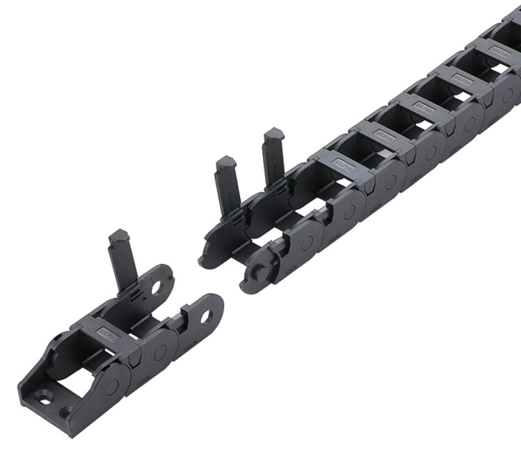 鋼鋁拖鏈適合于使用在往復運動的場合,能夠對內置的電纜、油管、氣管、水管等起到牽引和保護的作用。拖鏈的每一節都能打開,便于安裝和維修。運動時噪音低、耐磨,可高速運動。