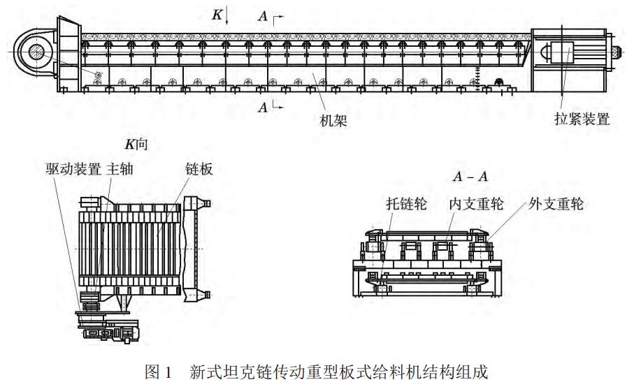 新式坦克鏈傳動重型板式給料機主要由驅動裝置、主軸、鏈板、機架、托鏈輪、內支重輪、外支重輪及拉緊裝置組成,見圖1。實際應用中根據不同的工況要求設計安裝給料機的長度,與此配套相應數量的托鏈輪和內支重輪。如長度為9m的給料機,其托鏈輪為34個,內支重輪為44個。新式給料機對輸送物料的粒度、溫度、黏度的變化有更好的適應性,同時具有給料量均勻、漏料少、便于安裝等優點,正逐步替代老式AC環傳動重型板式給料機,在采礦、冶金、建材和煤炭等行業得到迅速推廣使用。